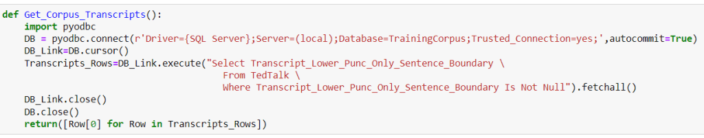 The third block collects the data that I will use for training. Instead of using the pandas library, I prefer using the pyodbc to interact with SQL databases. By using simple Python code and good variable names, I can avoid the more complex, non-SQL-like inconsistent API of pandas.