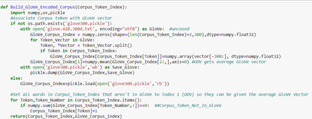 This next code creates two dictionaries. One dictionary assigns a unique integer to each word or token, and the other dictionary assigns a vector of decimal numbers (using GloVe) to represent the word/token in a pre-trained model. If a word is not found, it is given a special code (OOV or Out Of Vocabulary). The dictionary also includes a symbol for padding.