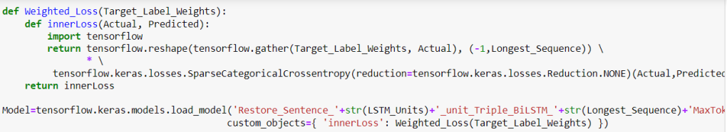 When you use this model to make predictions, you need to have the function mentioned earlier in the program. Additionally, the model must be loaded into memory, usually by restoring it from a saved version on disk. Here’s an example of code for a prediction program: