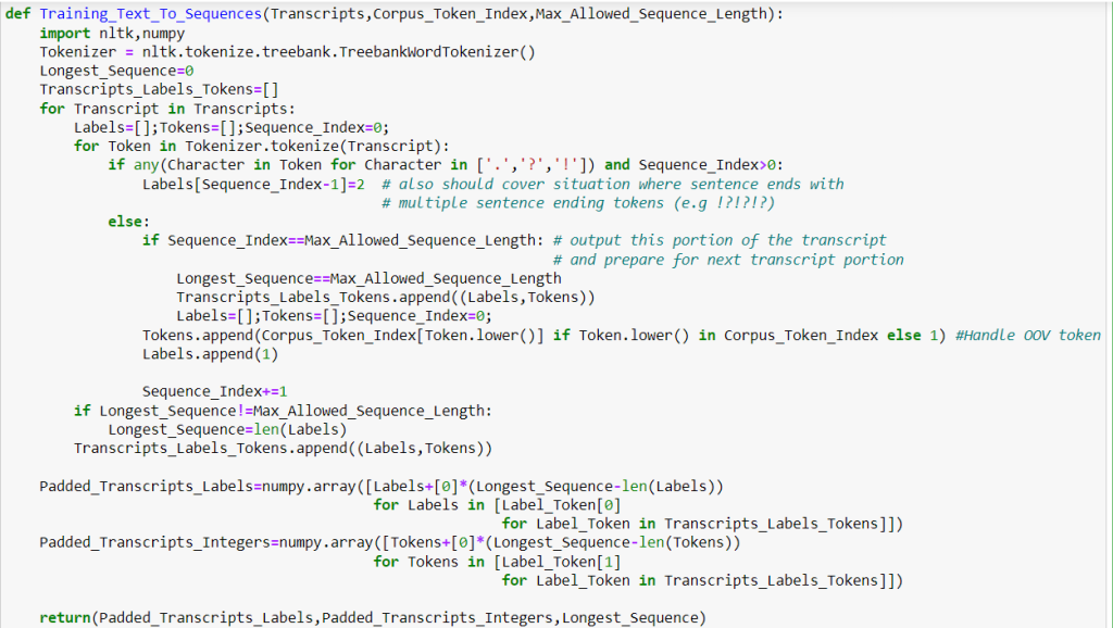 The code in this GitHub repository creates a deep learning model that can accurately (F1>.97) identify sentences in speech transcripts. The code also includes some unique techniques for solving sequence-to-sequence problems.