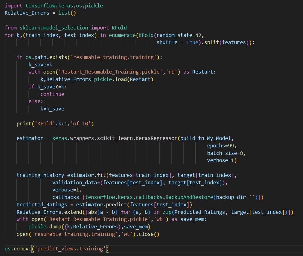Since Google or SciKit-Learn has not given us a similar simple line of code to handle K-Fold cross-validation resumes, I added several lines to a normal training procedure to address that. The most important one is to remember which of the folds the program was running when it was stopped.