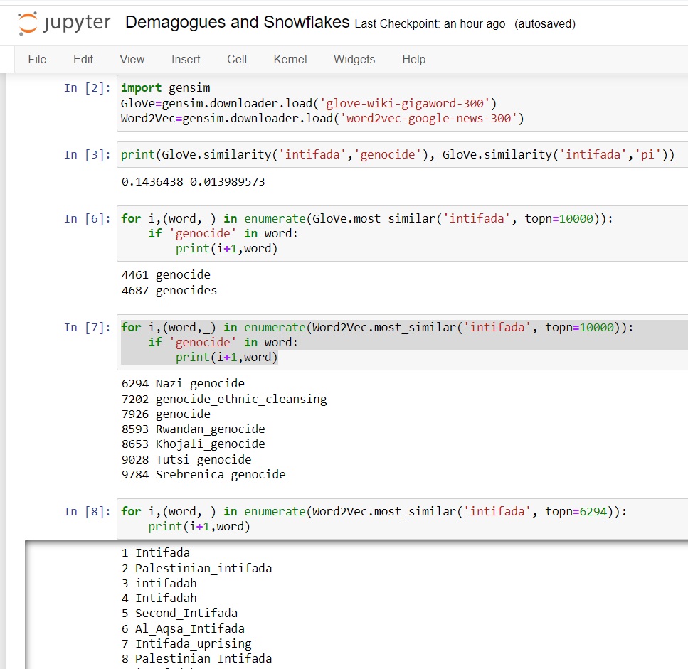 It found 4460 words more similar to intifada than genocide. GloVe gave the two words a similarity score of .14 (1=identical, -1 = opposite). For comparison, the words intifada and pi (the mathematical number) had a similarity score of .01. So, I guess genocide is a little more similar to intifada than the mathematical number PI. Congratulations demagogues???